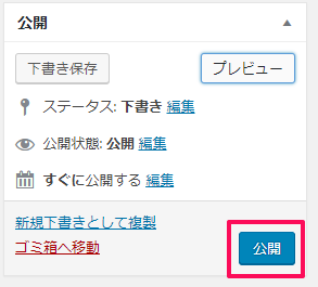 投稿記事の内容、アイキャッチ画像、ダウンロードファイル等、必要事項を確認し「公開」ボタンをクリックします。なお、公開する前には「プレビュー」を行い、投稿記事の状態を確認してください。