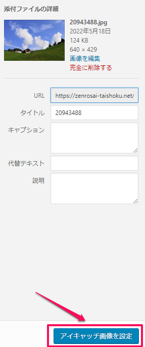 アップロードした画像をクリックし、次に右下の「アイキャッチ画像を設定」をクリックし設定します。