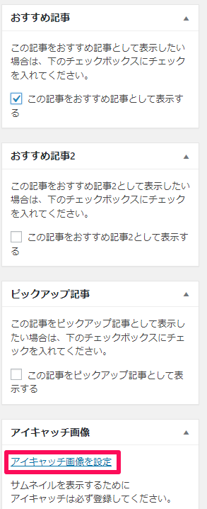 アイキャッチにする画像を用意してください。なお、画像の大きさは縦420Px、横640Px~縦480Px、横720Pxの物を用意する必要があります。「アイキャッチ画像を設定」をクリックします。
