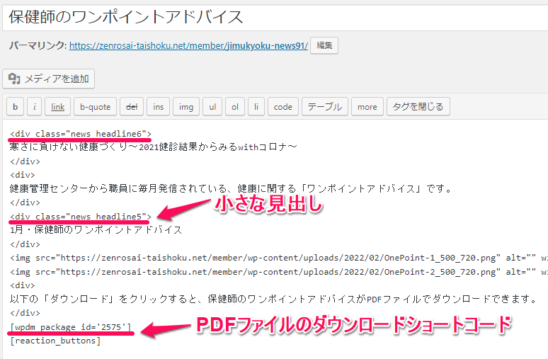 テキストの入力イメージは以下のようになります。見出しは下記の2種類を使用します。(退職者会の見出しは基本これ)