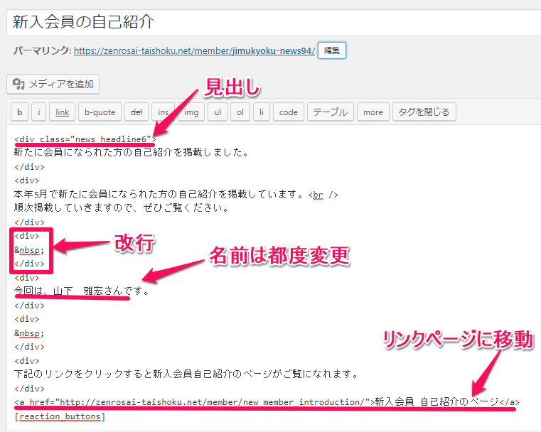 テキストの入力イメージは以下のようになります。見出しは下記の記述を使用します。(退職者会の見出しは基本これ)